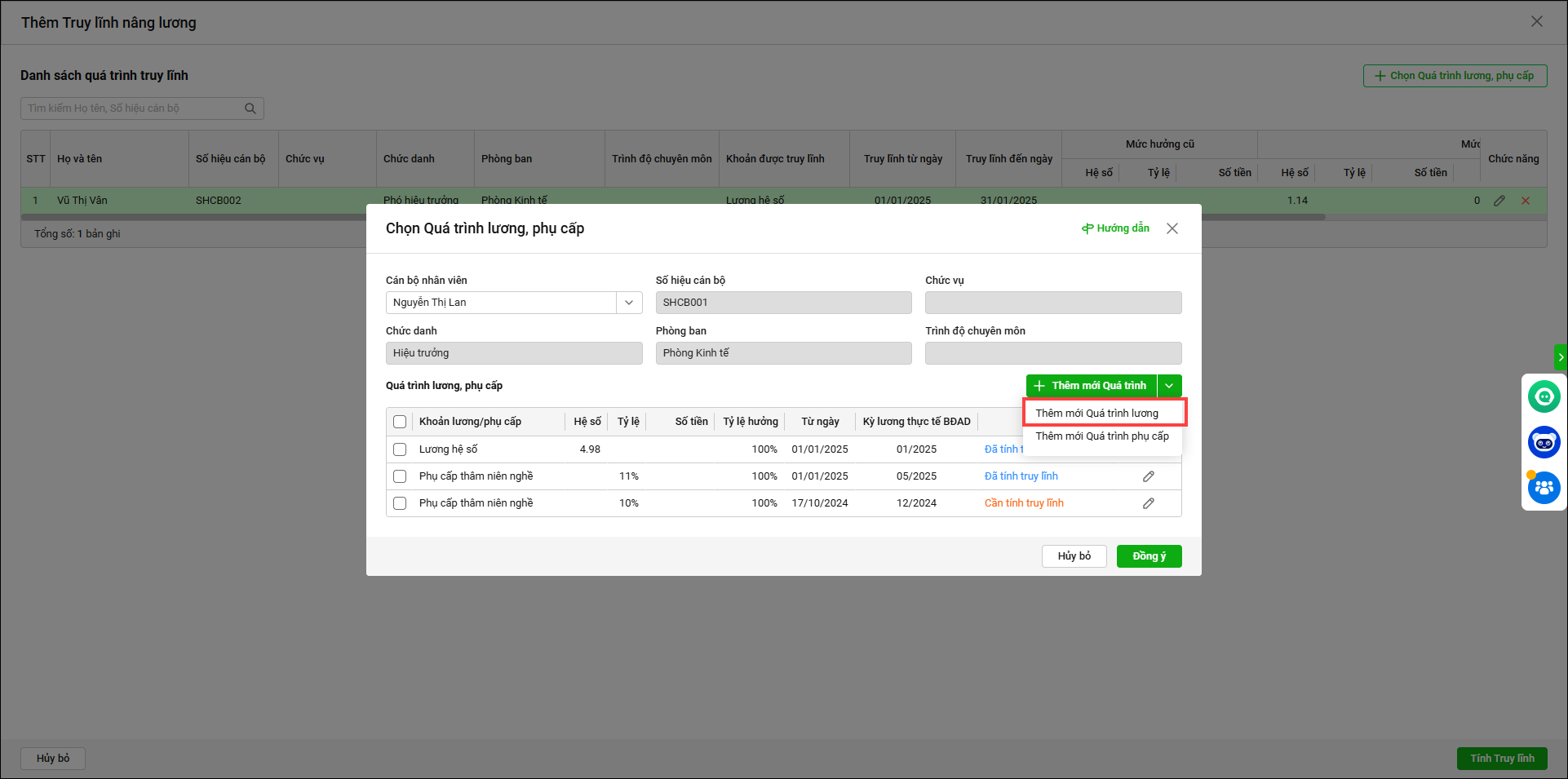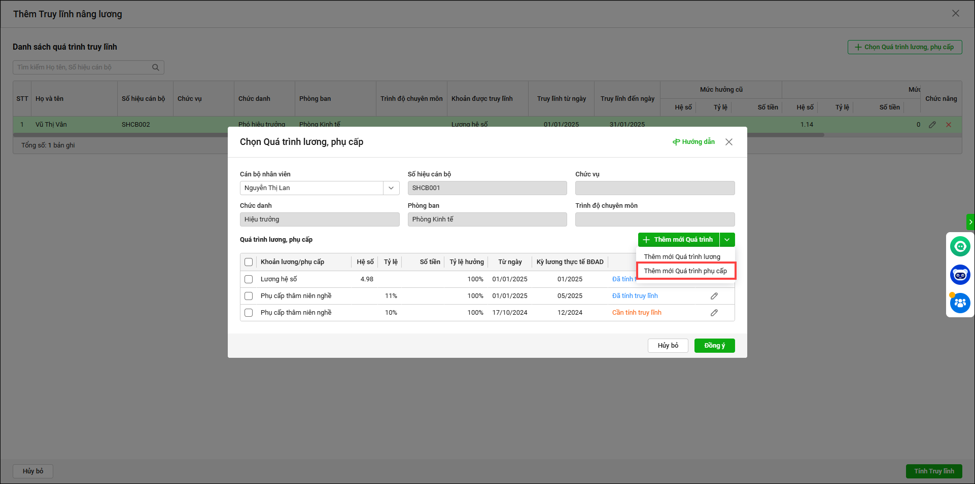 - Bấm chọn Thêm mới quá trình phụ cấp