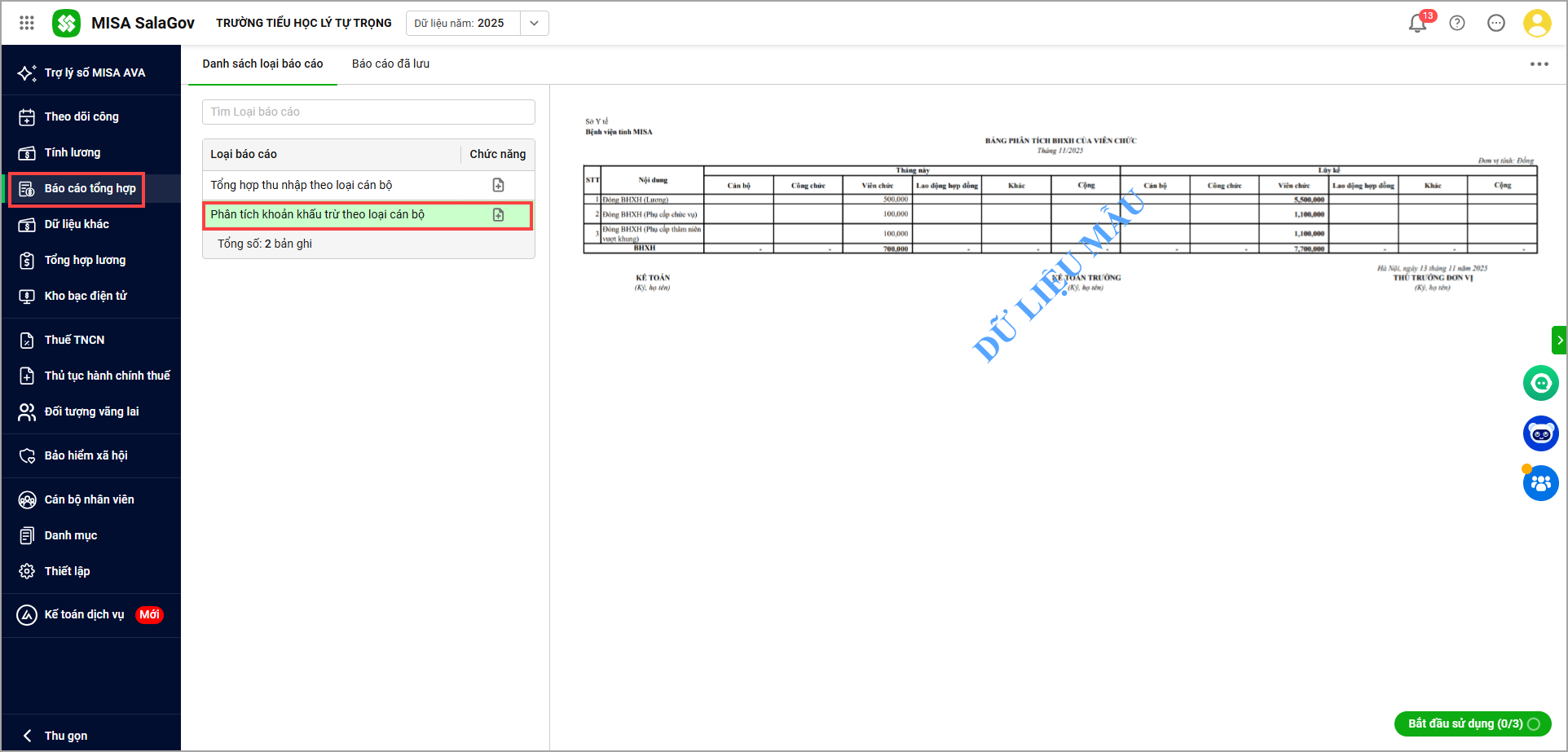 - Vào Báo cáo tổng hợp/Danh sách báo cáo/Phân tích khoản khấu trừ theo loại cán bộ