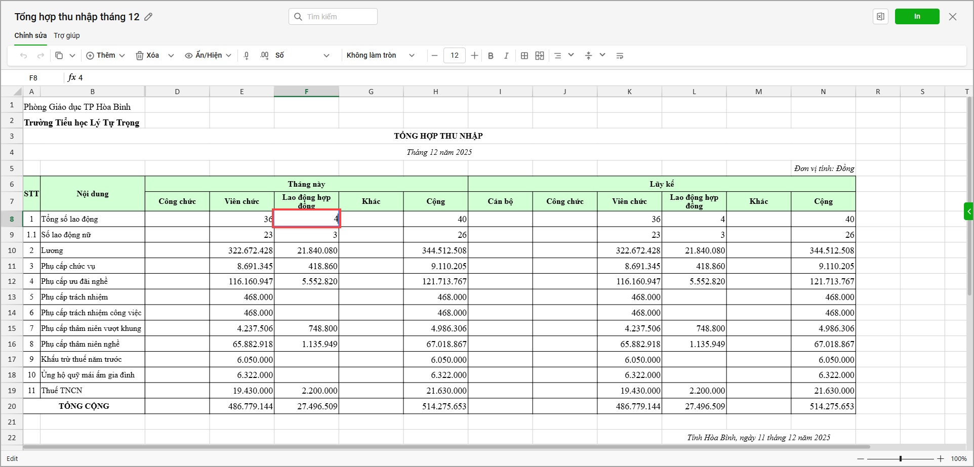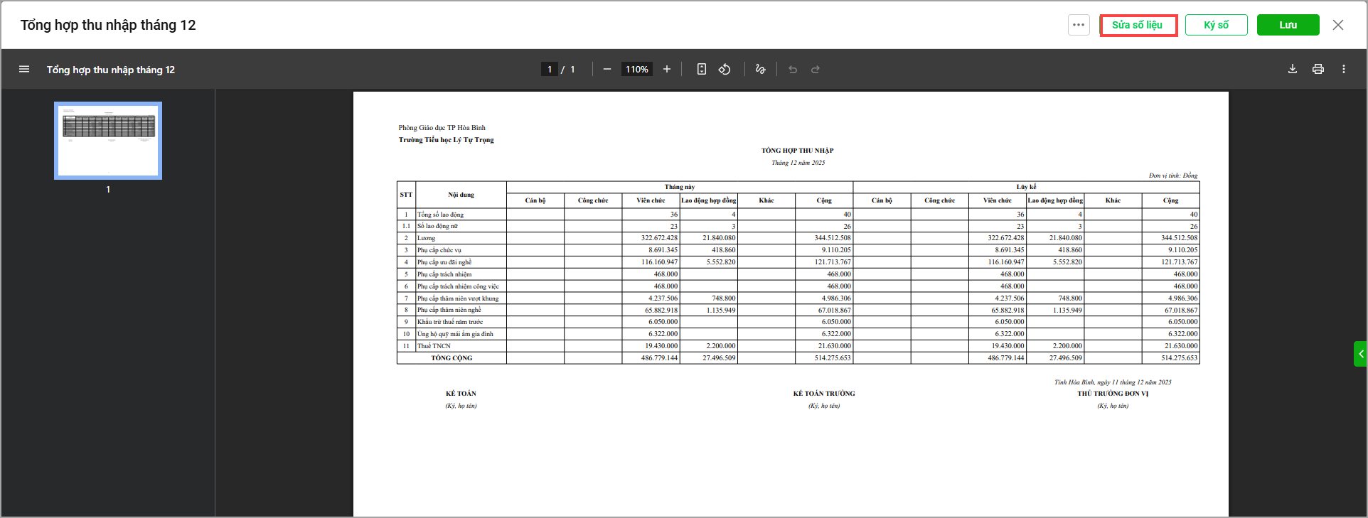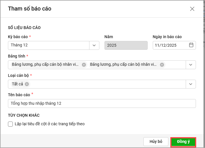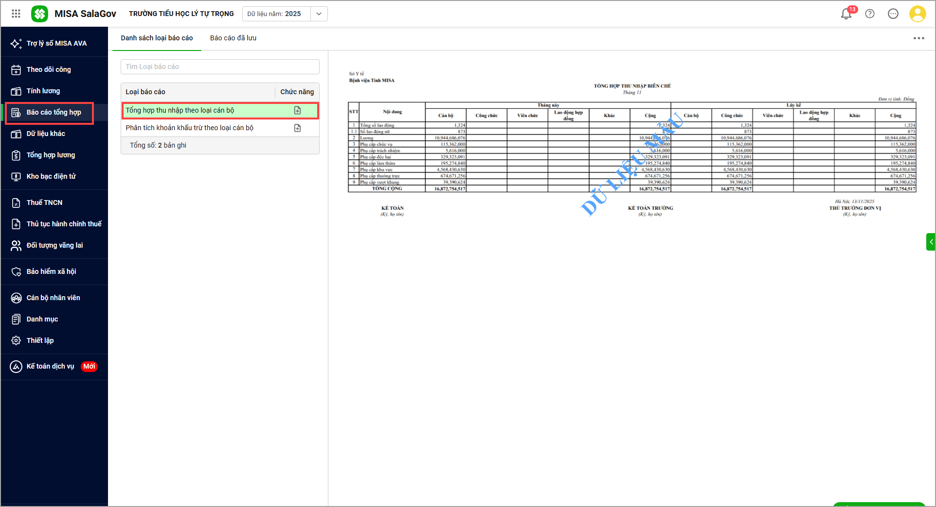 - Vào Báo cáo tổng hợp/Danh sách báo cáo/Tổng hợp thu nhập theo loại cán bộ