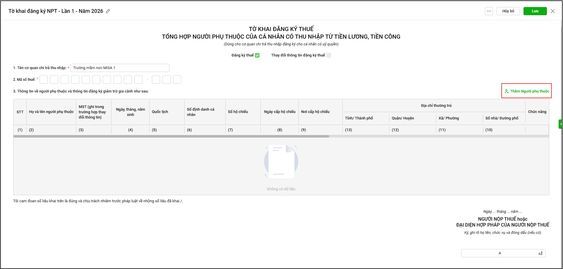 Bài viết hướng dẫn cách lập tờ khai đăng ký người phụ thuộc (NPT) mẫu 20-ĐK-TH-TCT (TT86) cho CBNV ngay trên phần mềm MISA SalaGov, phục vụ giảm trừ gia cảnh khi tính thuế TNCN mà không cần đến cơ quan thuế hoặc sử dụng Thuế điện tử.