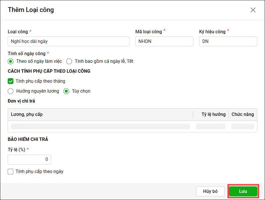 Bước 6: Sau khi thiết lập xong thông tin cho Loại công tại đơn vị, anh/chị nhấn Lưu.