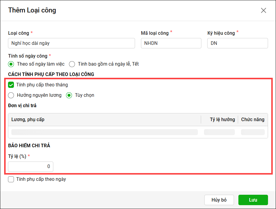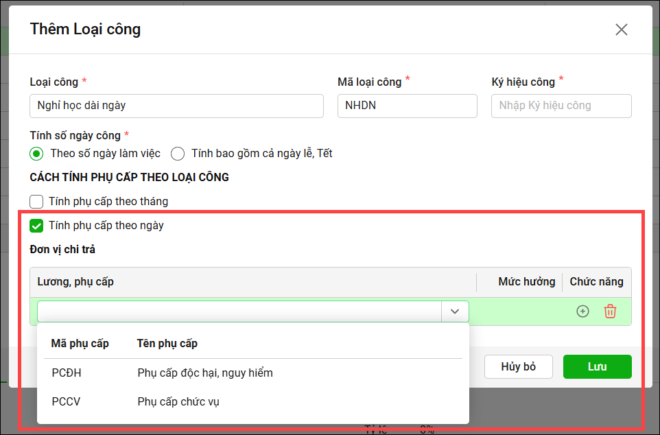 Bước 5: Thiết lập cách tính phụ cấp theo ngày hoặc theo tháng: