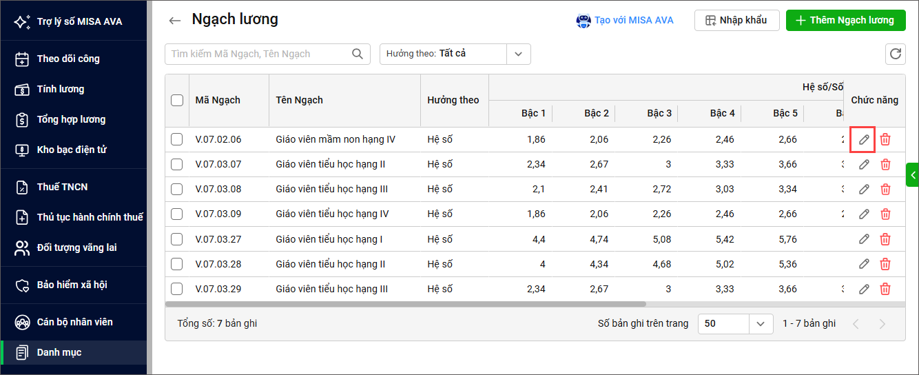 Bước 1: Để sửa thông tin Ngạch lương, anh/chị chọn biểu tượng .