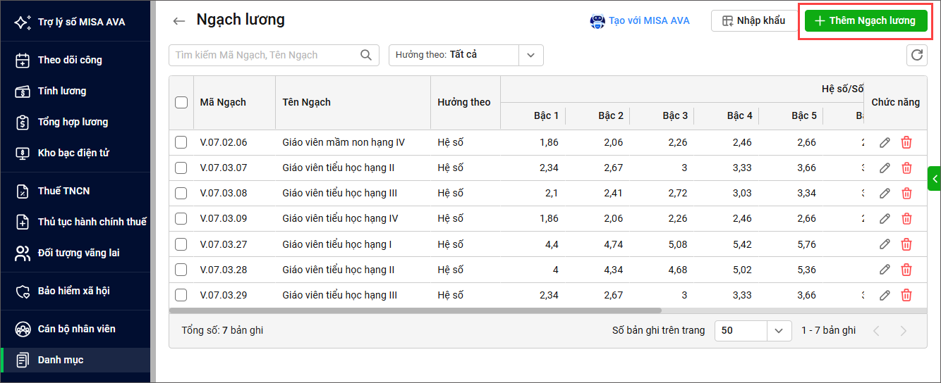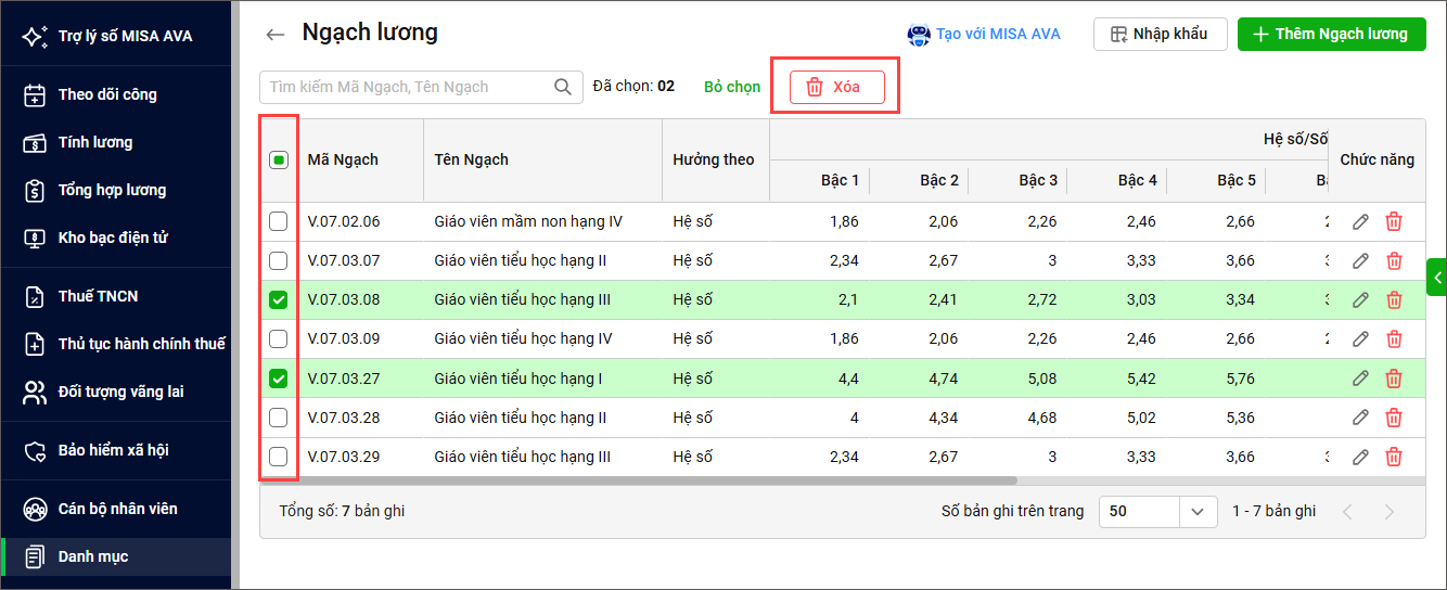 Bước 2: Để xóa Ngạch lương, tích chọn Ngạch lương đó và chọn biểu tượng để xóa.