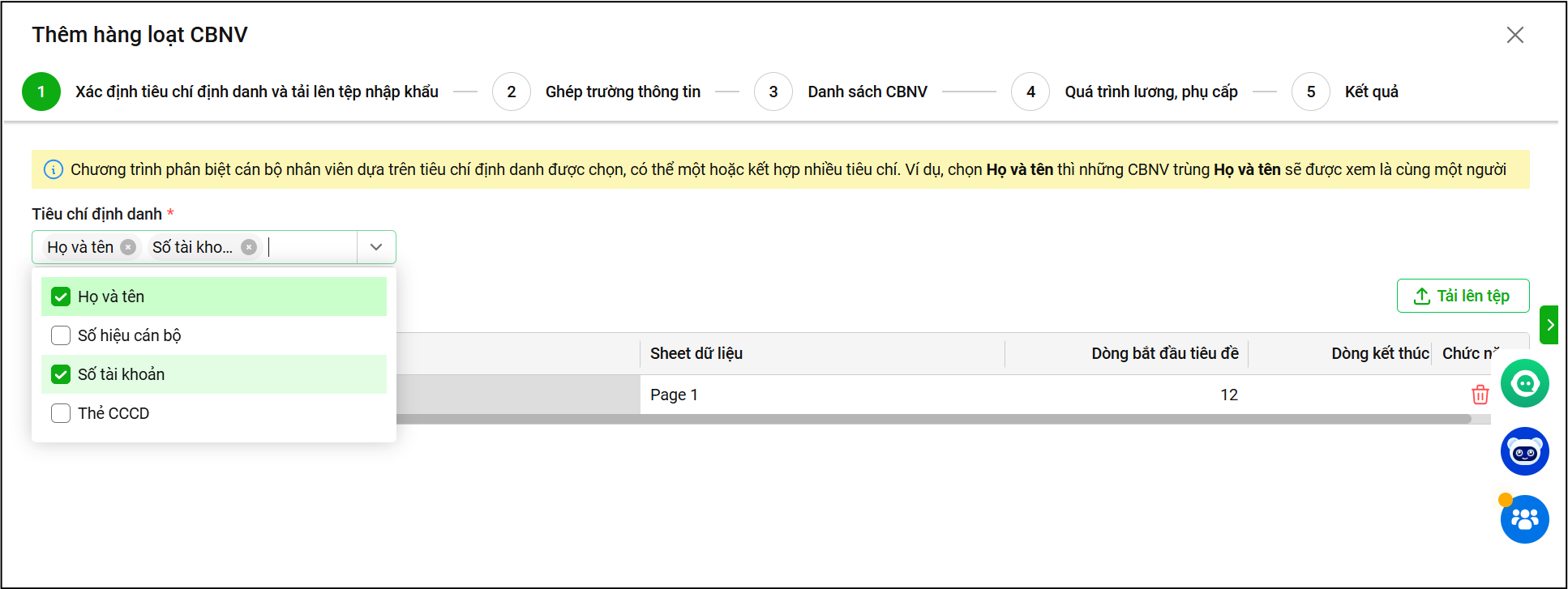 - Chọn tiêu chí định danh nào thì file Excel bắt buộc phải có cột thông tin tương ứng.
