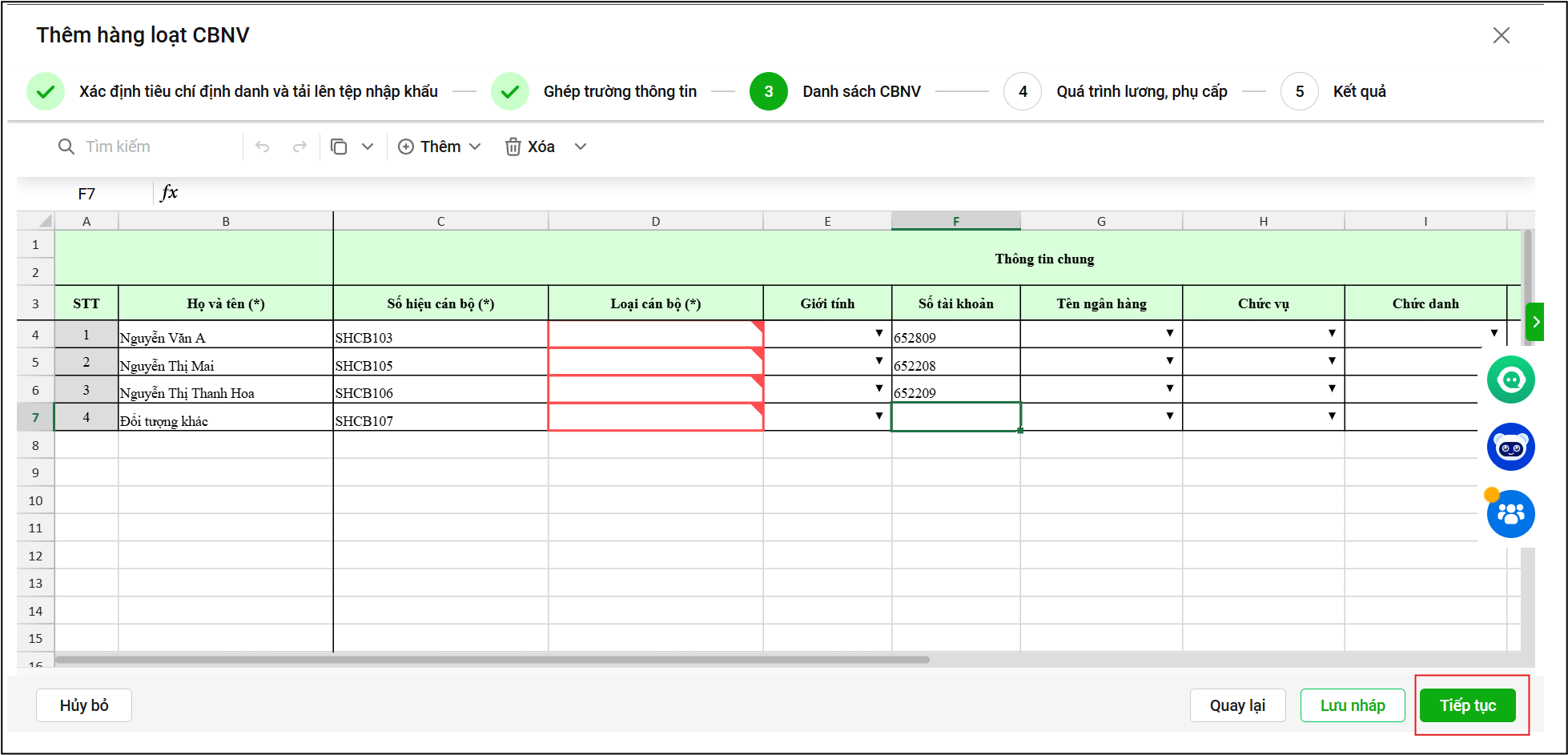 Bước 6: Phần mềm hiện ra Danh sách CBNV, kiểm tra thông tin và có thể sửa, xóa, nhập trực tiếp thông tin vào trên bảng (thao tác như trên Excel), sau đó nhấn Tiếp tục