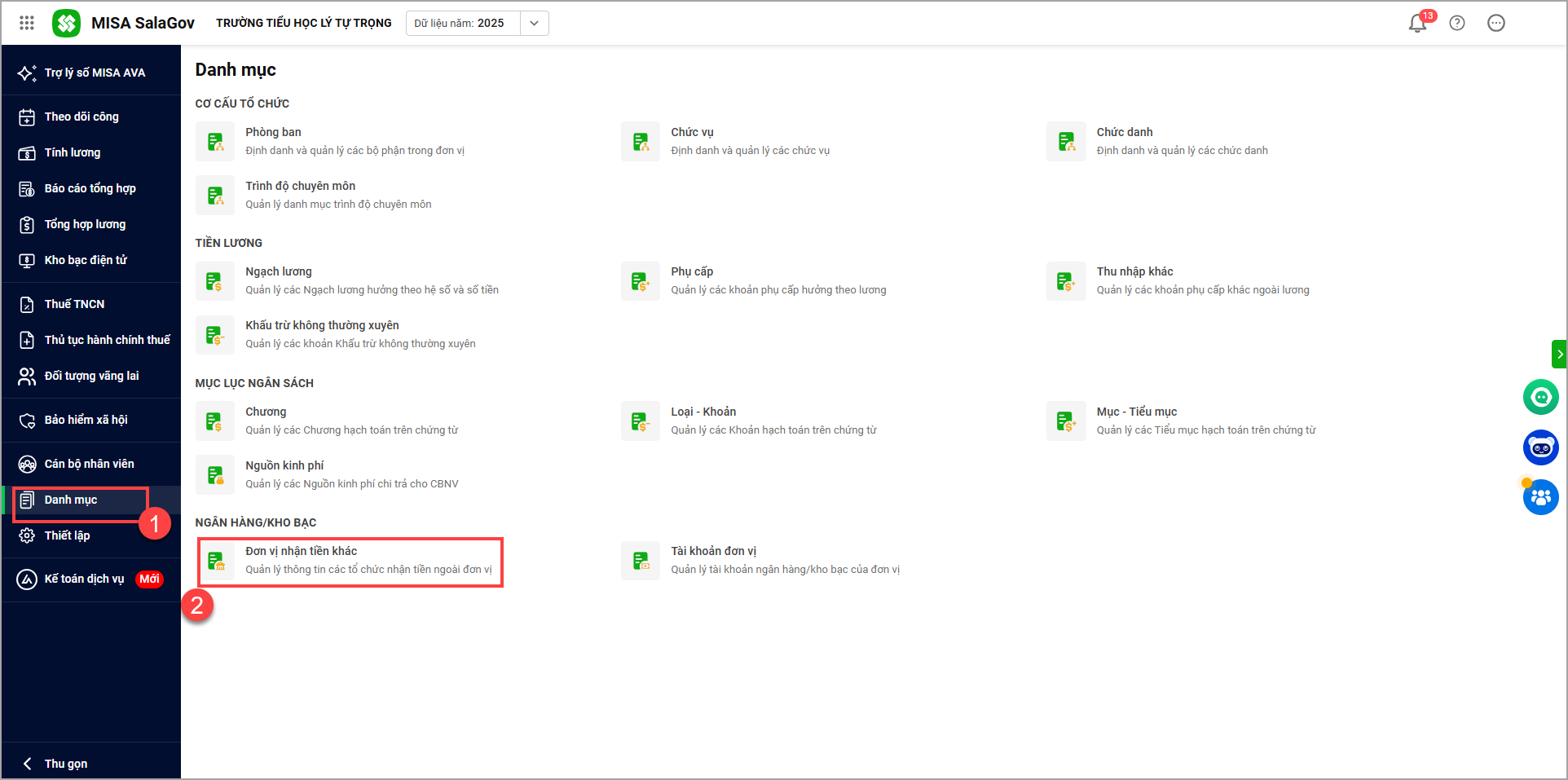 - Vào Danh mục/Đơn vị tài khoản nhận tiền