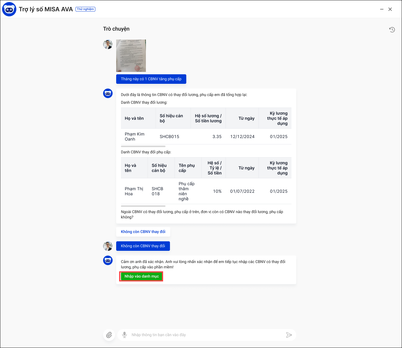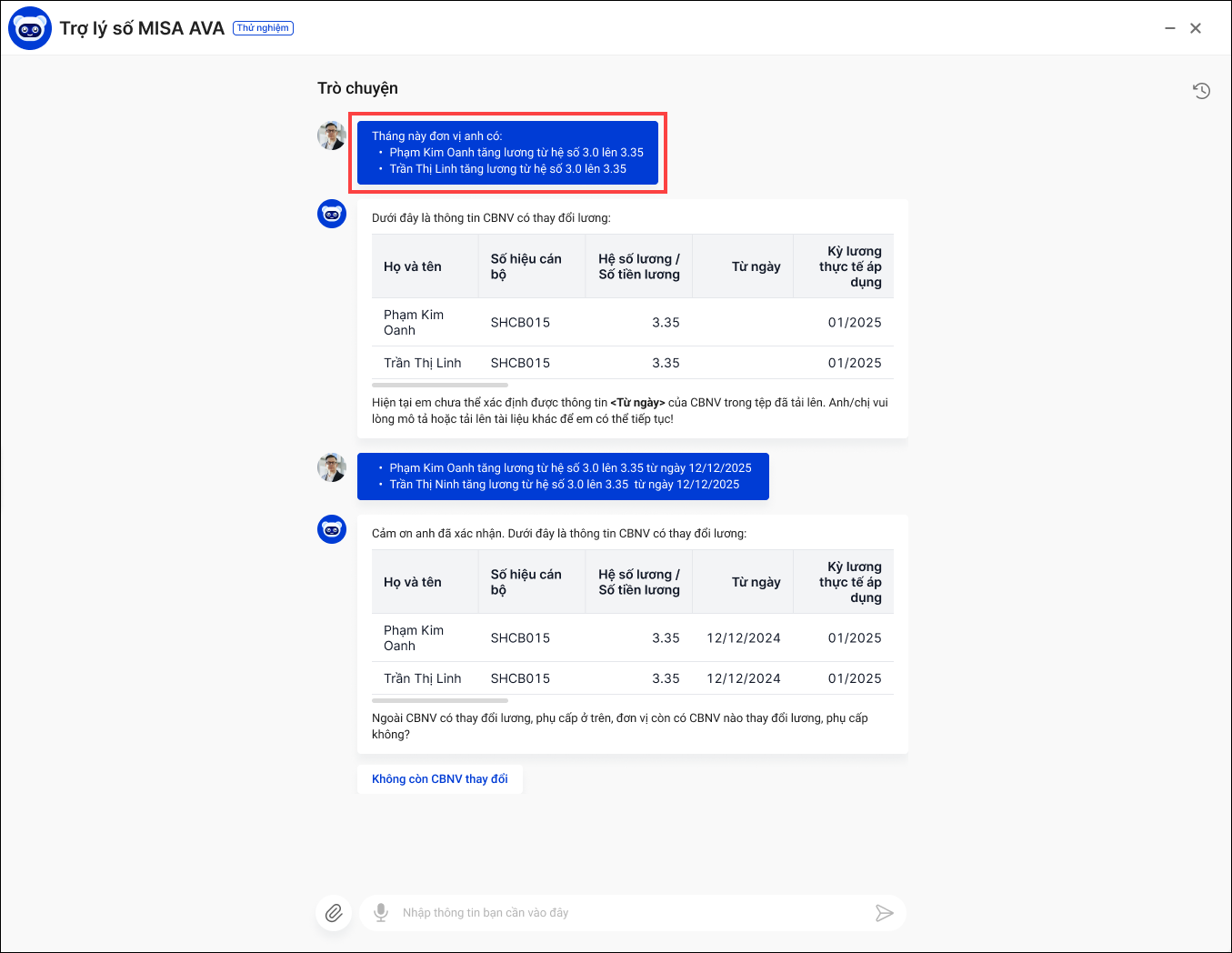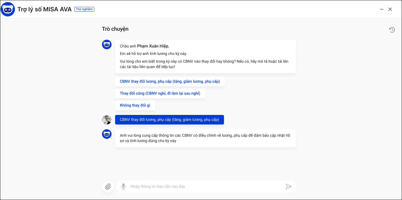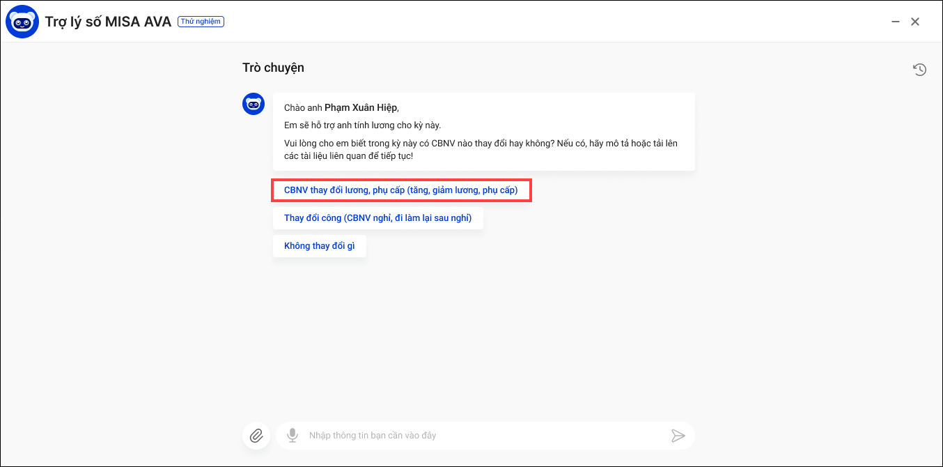 2. Phần mềm hiển thị khung chat với trợ lý MISA AVA. Gợi ý anh/chị 1 số chức năng mà ÂVA có thể hỗ trợ thực hiện nhanh như: Thay đổi lương, phụ cấp; Thay đổi công..