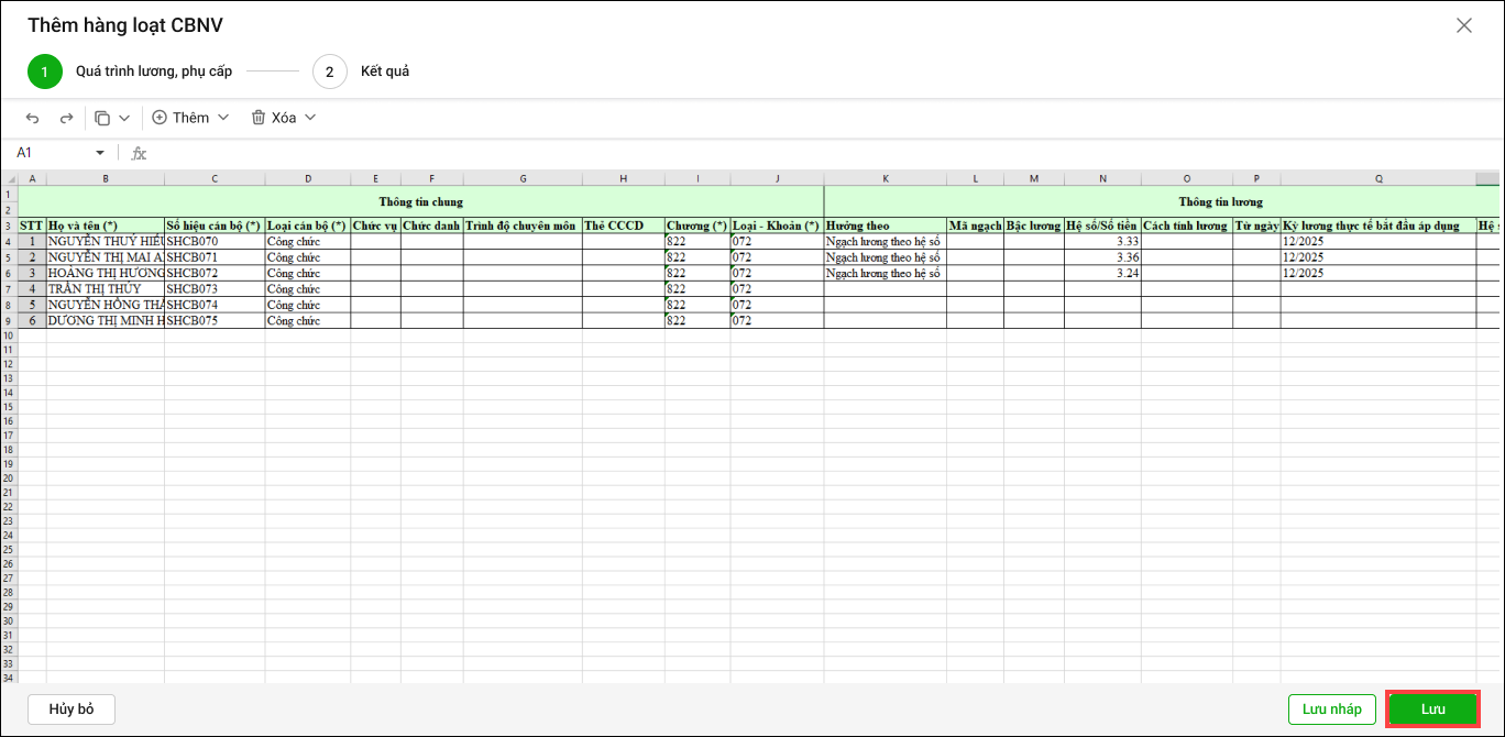 5. Chương trình tự động thêm thông tin của CBNV vào quá trình lương, phụ cấp. Kiểm tra lại thông tin sau đó nhấn Lưu