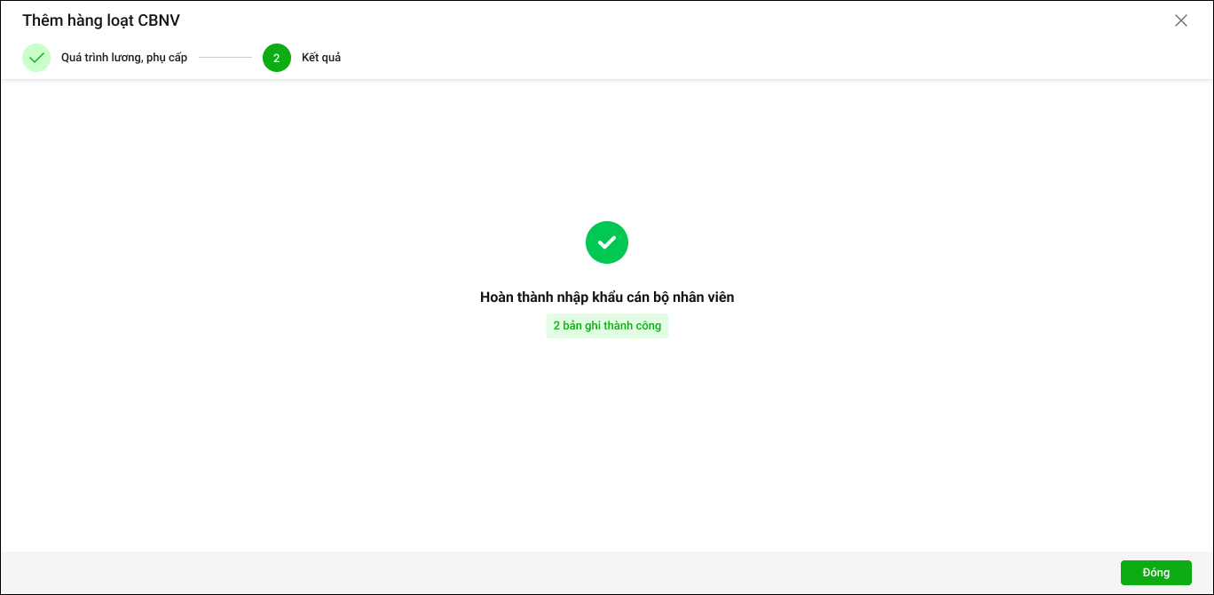 6. Chương trình thông báo nhập khẩu thành công cán bộ nhân viên. Nhấn nút Đóng.